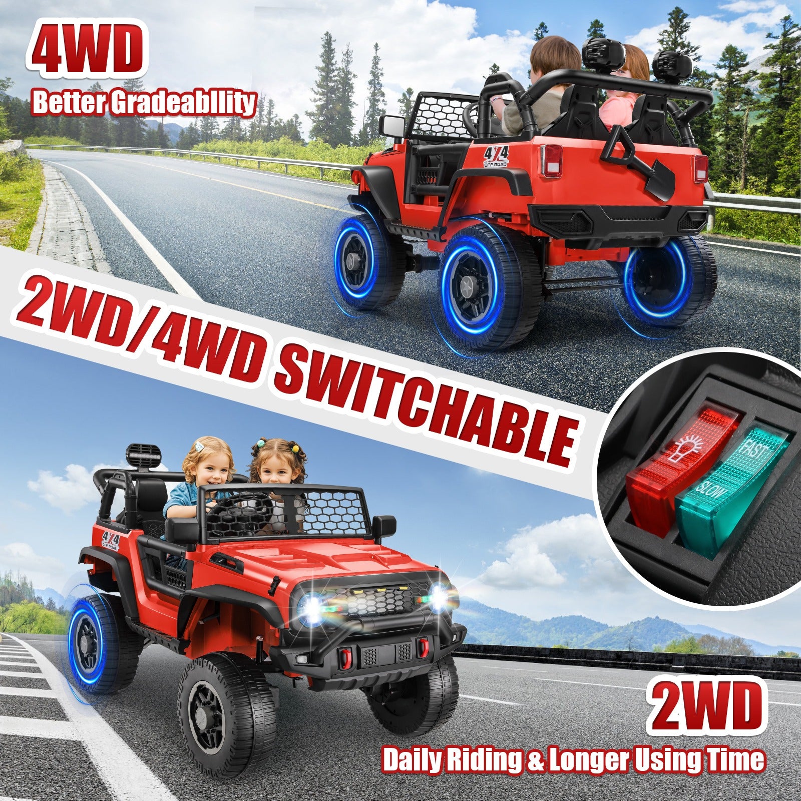 Enjoy an exciting and fun ride with our 24V ride-on toys! Equipped with a powerful motor of 4×100W, the child can perform better on challenging terrains such as hills, grass, slopes, and even beaches, as our 2WD/4WD switchable ride-on toys for toddlers can provide more stable and powerful power (maximum 6MPH) compared to a regular dual-drive toy car; Switching our electric car for kids to dual-drive mode will save more power, and equipped with a large 24V battery will make the kids play more fun! Such thoughtful battery powered riding toys are equipped with parent remote control (3 speed modes), 3-point seat belt, two extra wide seats, wear-resistant wheels, and four-wheel shock suspension to make the driving process safer and more comfortable for children!